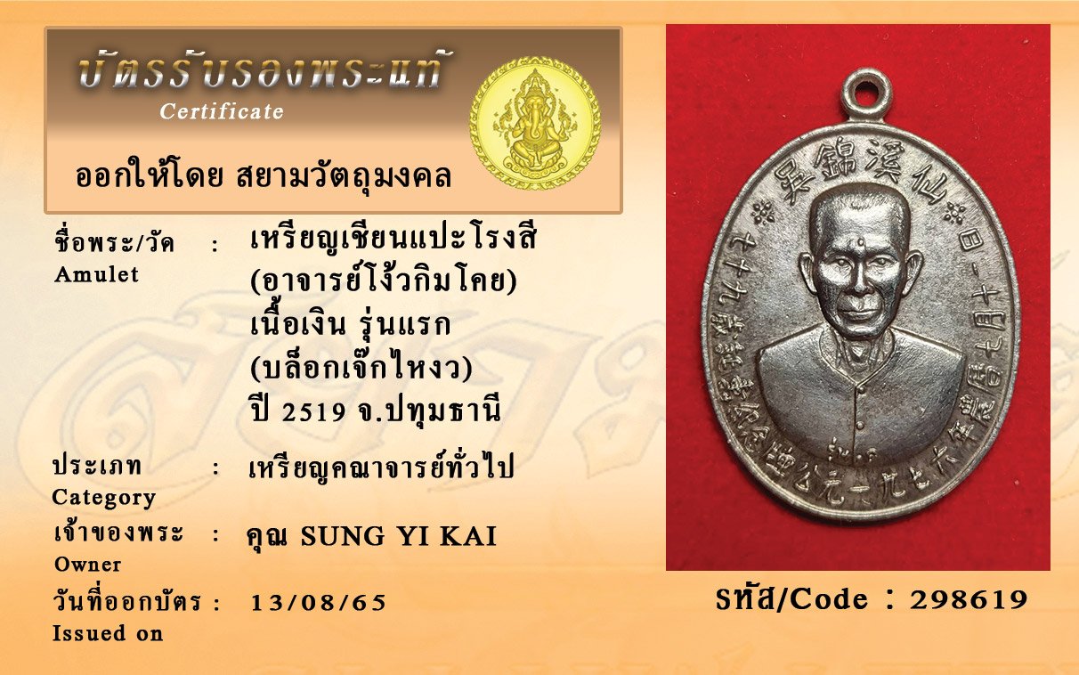 รหัสสินค้า : 298619 เหรียญเชียนแปะโรงสี (อาจารย์โง้วกิมโคย) เนื้อเงิน รุ่นแรก (บล็อกเจ๊กไหงว) ปี 2519 จ.ปทุมธานี