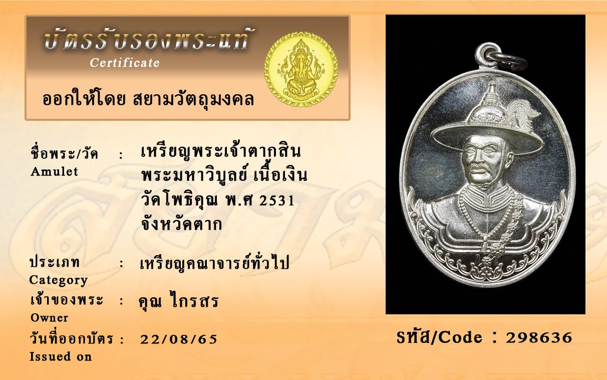 รหัสสินค้า : 298636 เหรียญพระเจ้าตากสิน พระมหาวิบูลย์ เนื้อเงิน วัดโพธิคุณ พ.ศ 2531 จังหวัดตาก