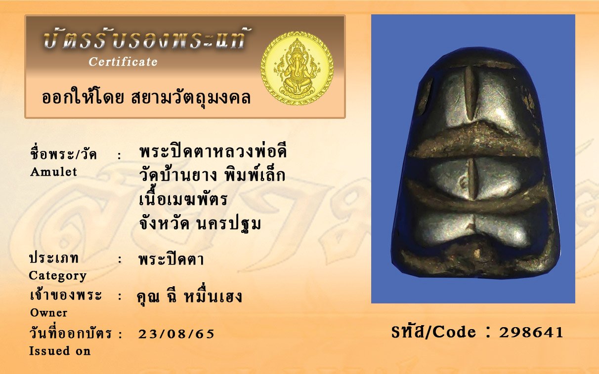 รหัสสินค้า : 298641 พระปิดตาหลวงพ่อดี วัดบ้านยาง พิมพ์เล็ก เนื้อเมฆพัตร จังหวัด นครปฐม