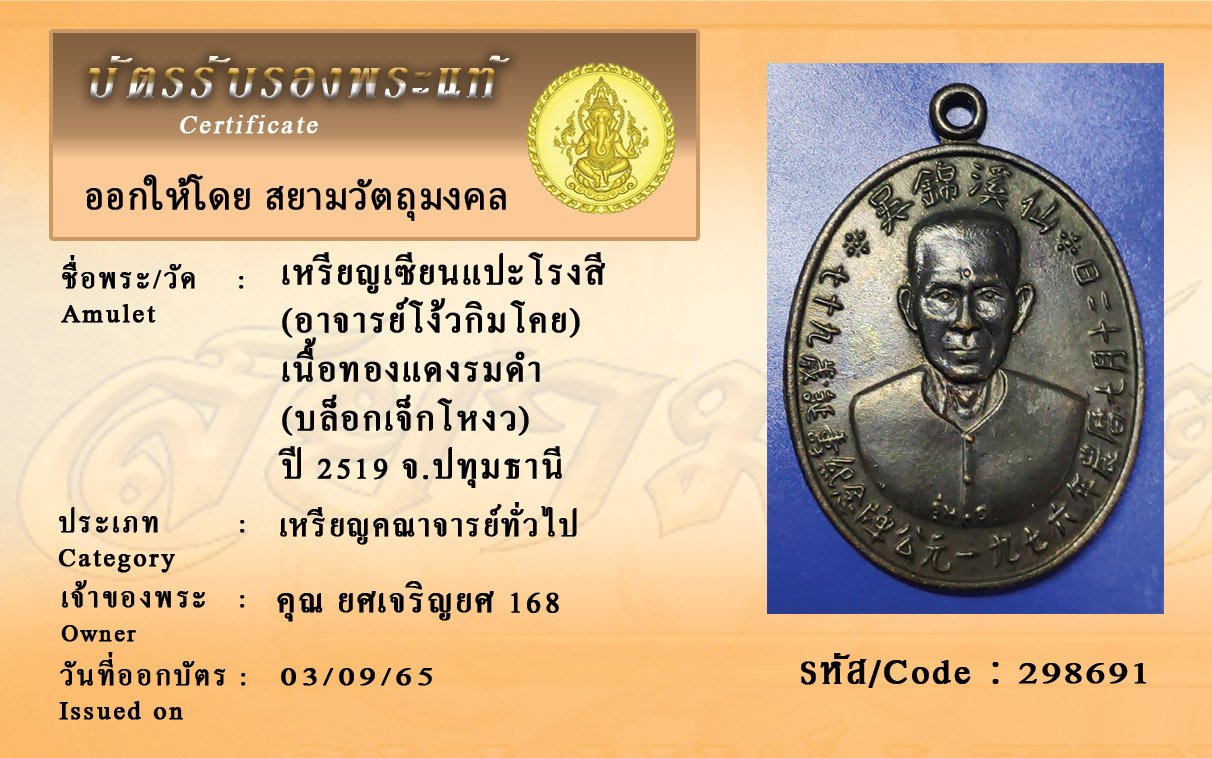 รหัสสินค้า : 298691 เหรียญเซียนแปะโรงสี (อาจารย์โง้วกิมโคย) เนื้อทองแดงรมดำ (บล็อกเจ็กโหงว) ปี 2519 จ.ปทุมธานี