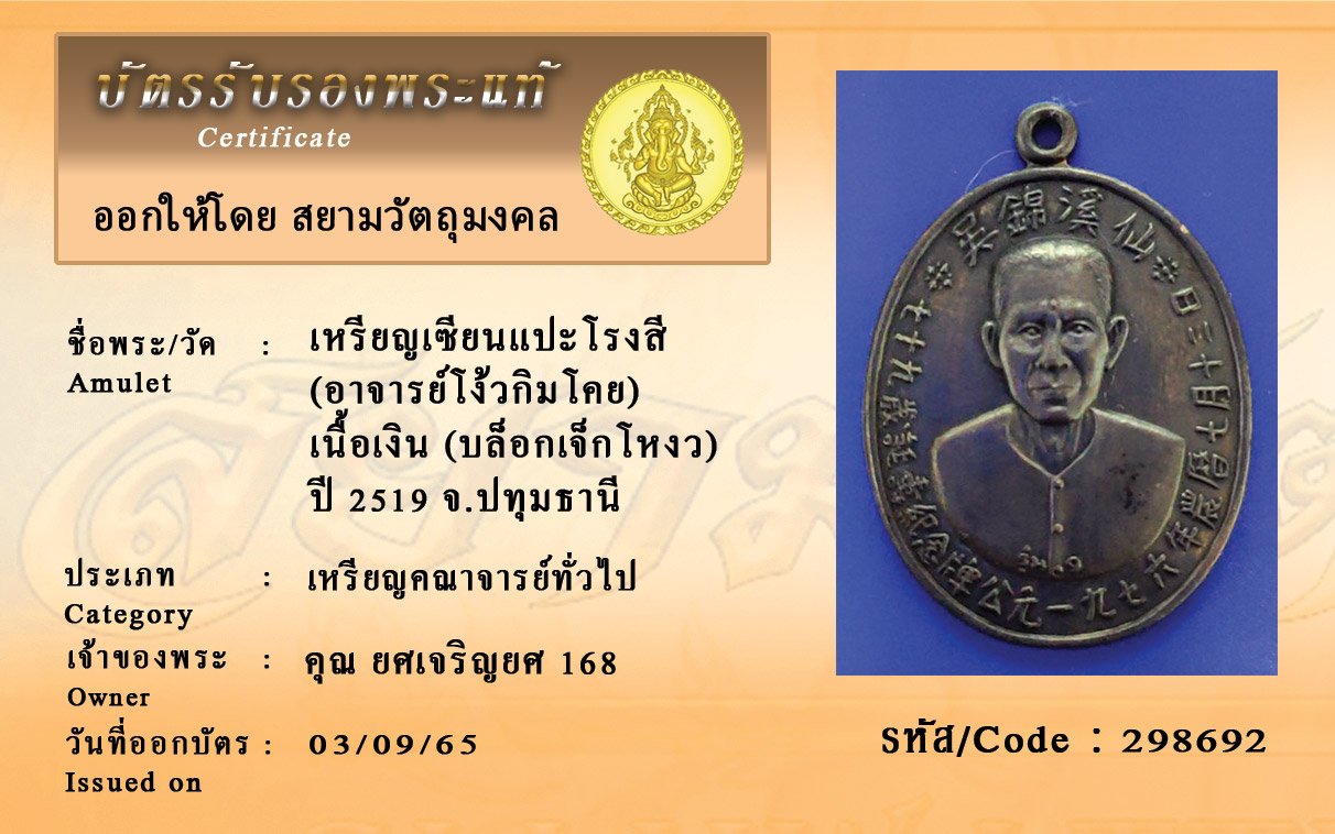 รหัสสินค้า : 298692 เหรียญเซียนแปะโรงสี (อาจารย์โง้วกิมโคย) เนื้อเงิน (บล็อกเจ็กโหงว) ปี 2519 จ.ปทุมธานี