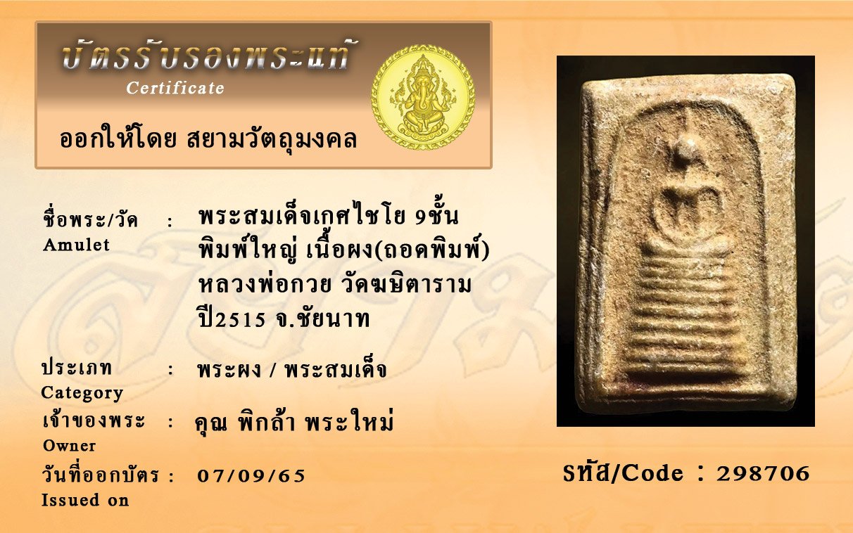 รหัสสินค้า : 298706 พระสมเด็จเกศไชโย 9ชั้น พิมพ์ใหญ่ เนื้อผง(ถอดพิมพ์) หลวงพ่อกวย วัดฆษิตาราม ปี2515 จ.ชัยนาท