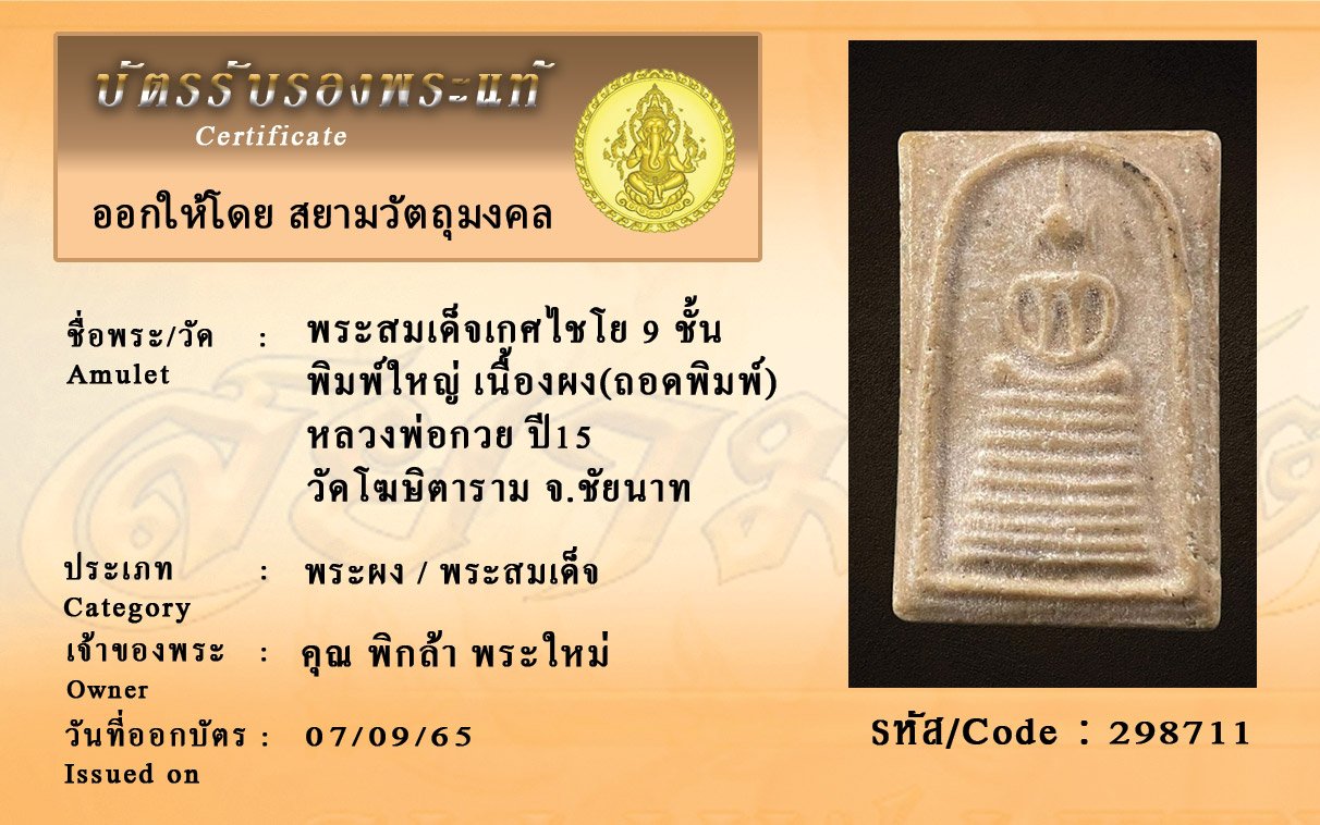 รหัสสินค้า : 298711 พระสมเด็จเกศไชโย 9 ชั้น พิมพ์ใหญ่ เนื้องผง(ถอดพิมพ์) หลวงพ่อกวย ปี15 วัดโฆษิตาราม จ.ชัยนาท