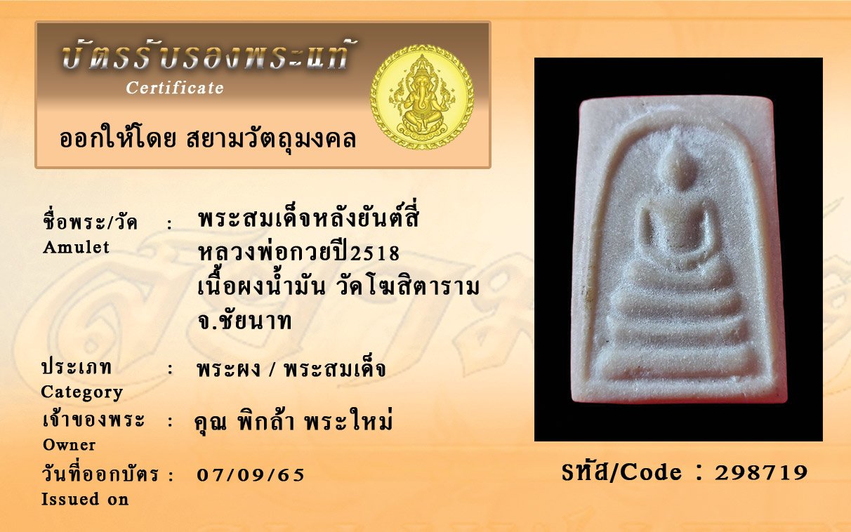 รหัสสินค้า : 298719 พระสมเด็จหลังยันต์สี่ หลวงพ่อกวยปี2518 เนื้อผงน้ำมัน วัดโฆสิตาราม จ.ชัยนาท