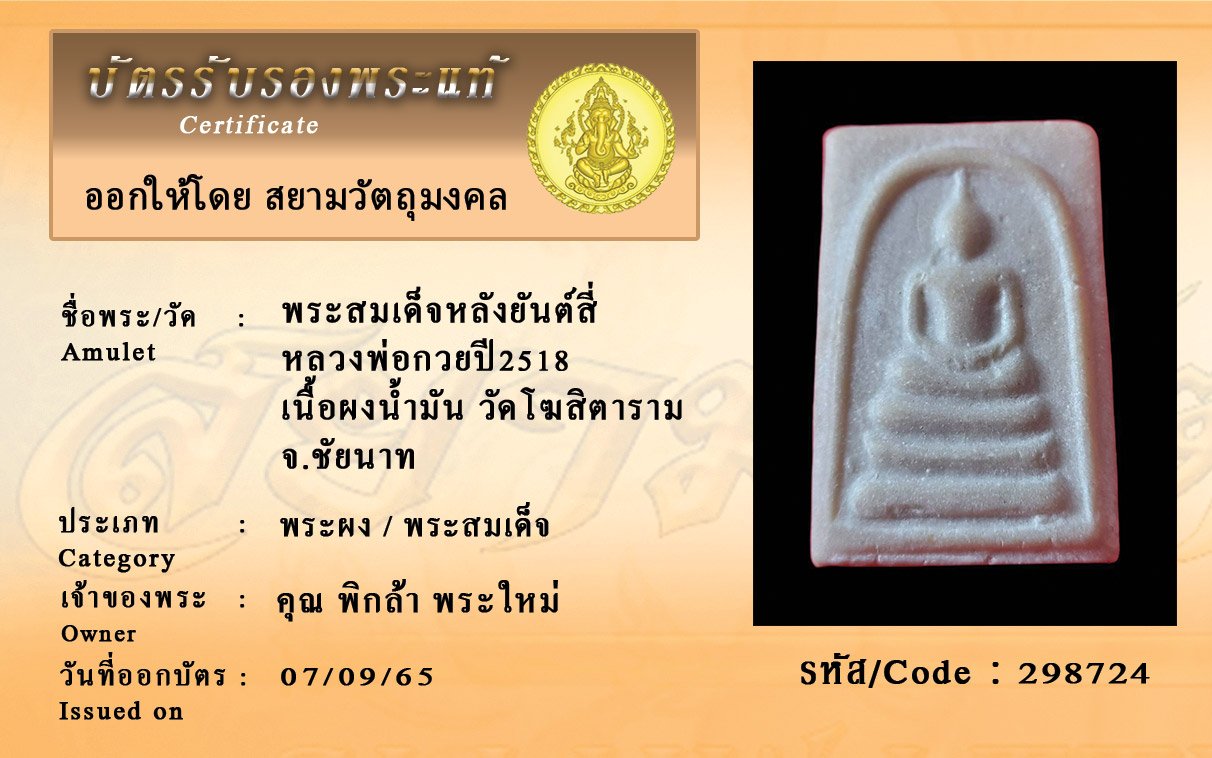 รหัสสินค้า : 298724 พระสมเด็จหลังยันต์สี่ หลวงพ่อกวยปี2518 เนื้อผงน้ำมัน วัดโฆสิตาราม จ.ชัยนาท