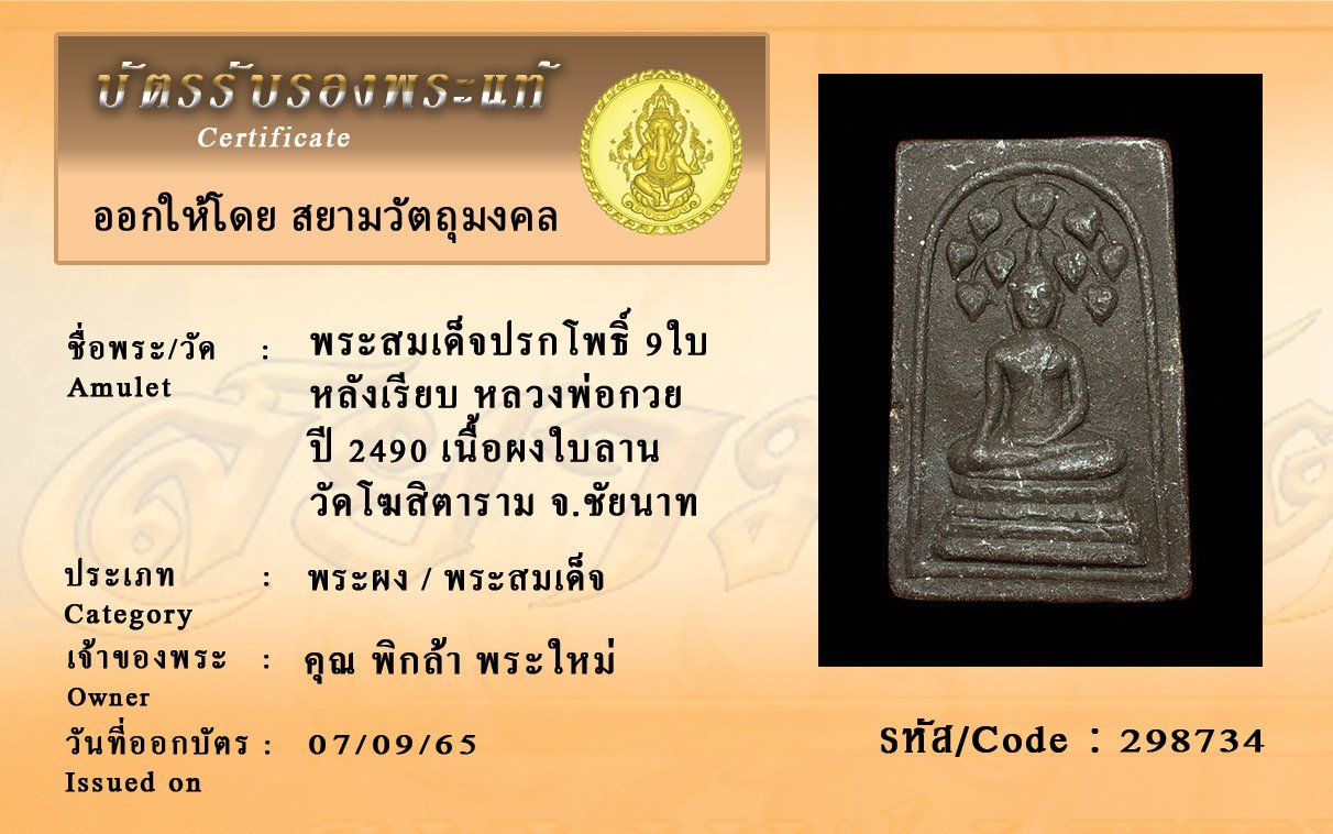 รหัสสินค้า : 298734 พระสมเด็จปรกโพธิ์ 9ใบ หลังเรียบ หลวงพ่อกวย ปี 2490 เนื้อผงใบลาน วัดโฆสิตาราม จ.ชัยนาท