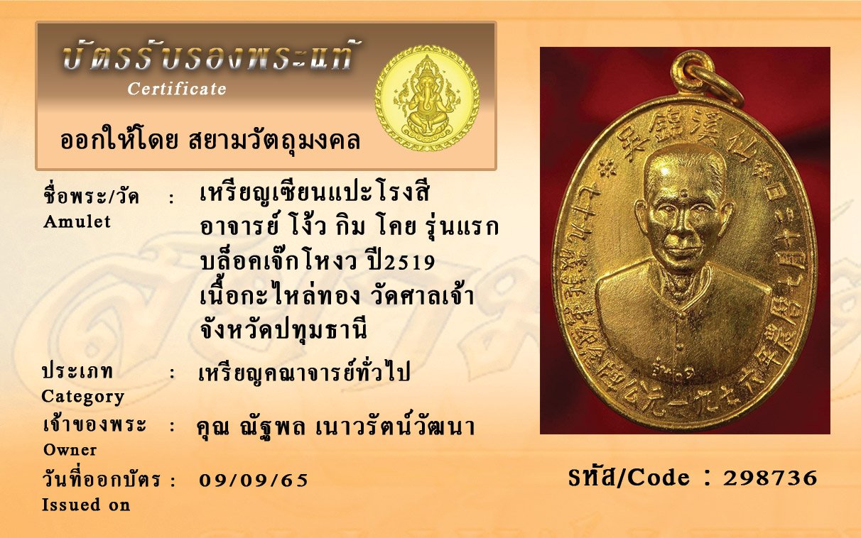 รหัสสินค้า : 298736 เหรียญเซียนแปะโรงสี อาจารย์ โง้ว กิม โคย รุ่นแรก บล็อคเจ๊กโหงว ปี2519 เนื้อกะไหล่ทอง วัดศาลเจ้า จังหวัดปทุมธานี
