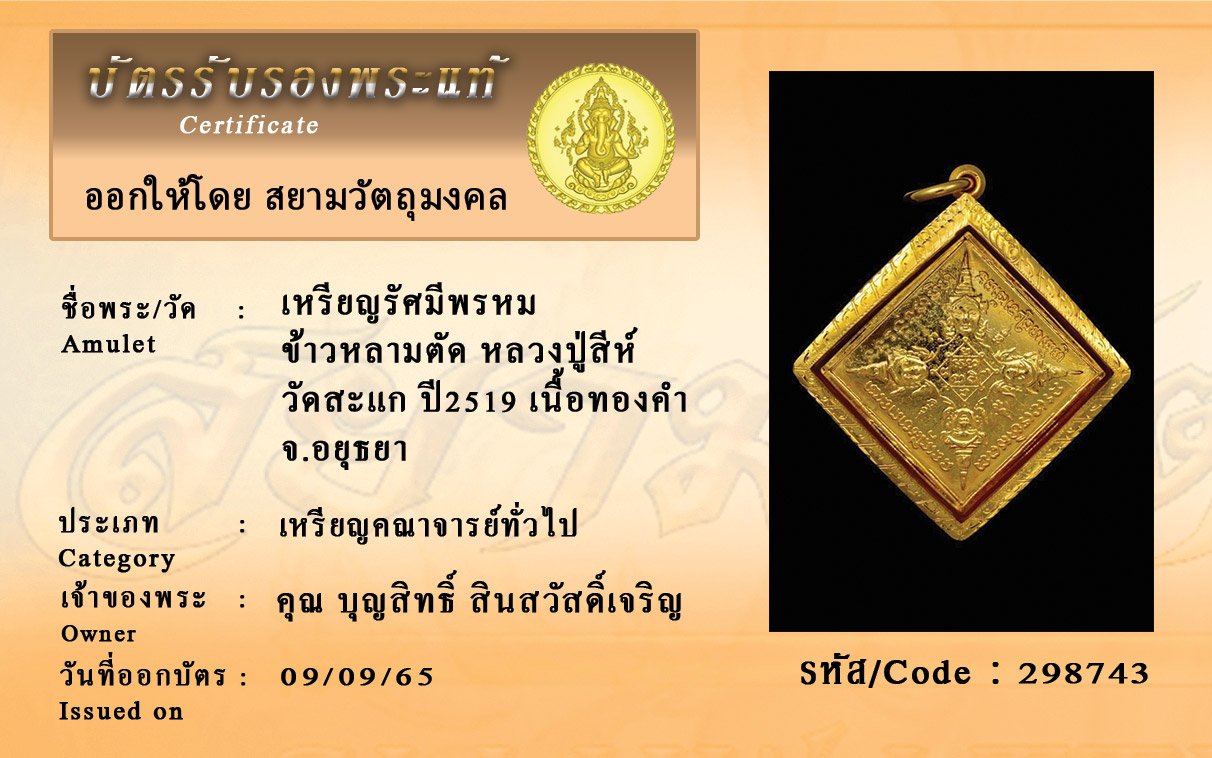 รหัสสินค้า : 298743 เหรียญรัศมีพรหม ข้าวหลามตัด หลวงปู่สีห์ วัดสะแก ปี2519 เนื้อทองคำ จ.อยุธยา
