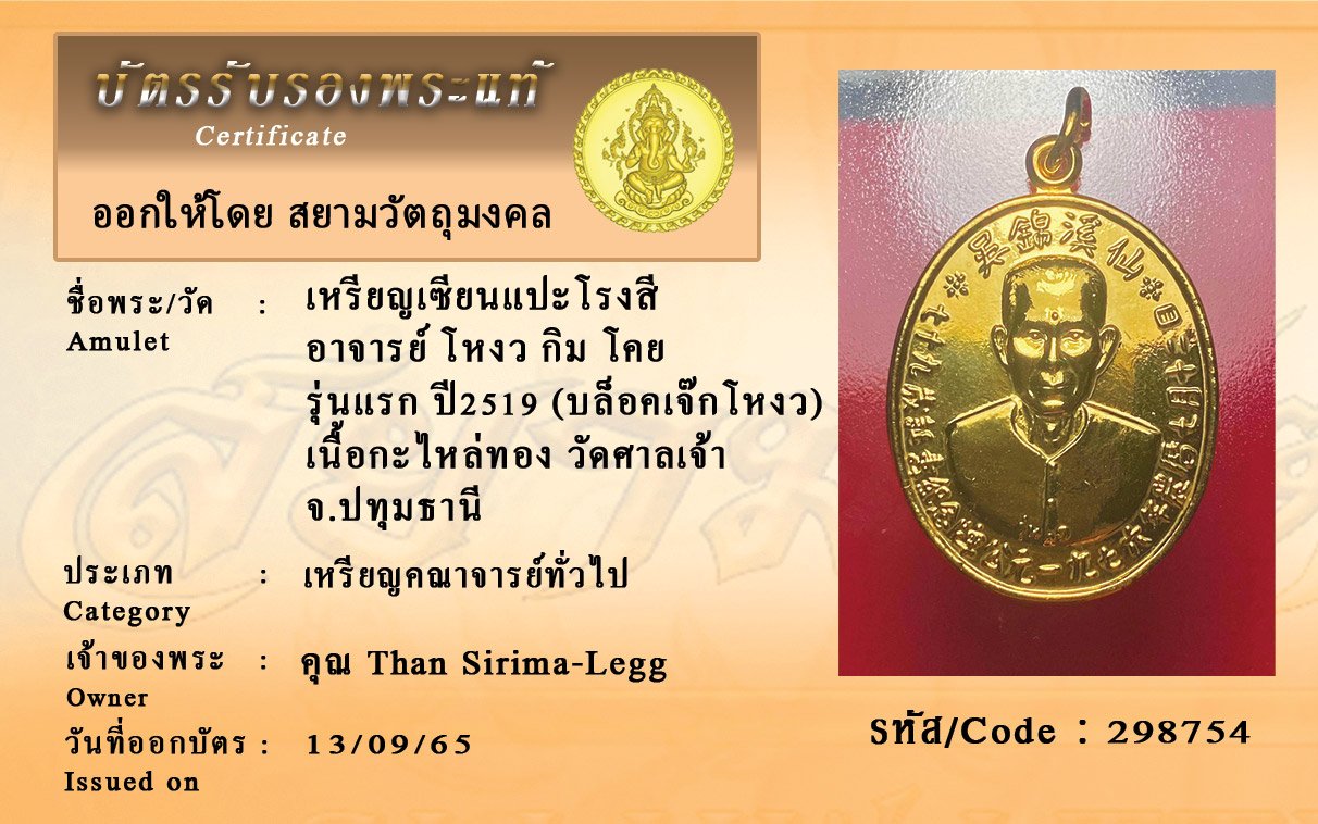 รหัสสินค้า : 298754 เหรียญเซียนแปะโรงสี อาจารย์ โหงว กิม โคย รุ่นแรก ปี2519 (บล็อคเจ๊กโหงว) เนื้อกะไหล่ทอง วัดศาลเจ้า จ.ปทุมธานี