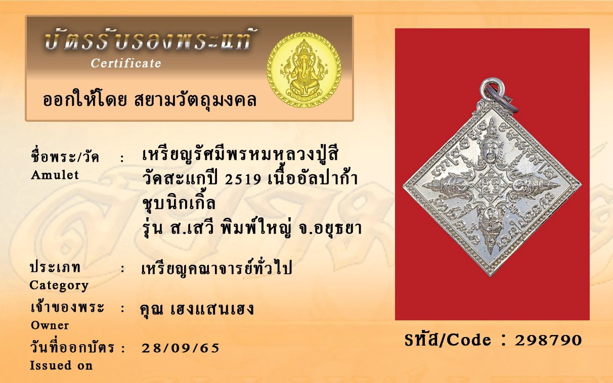 รหัสสินค้า : 298790 เหรียญรัศมีพรหมหลวงปู่สี วัดสะแกปี 2519 เนื้ออัลปาก้า ชุบนิกเกิ้ล รุ่น ส.เสวี พิมพ์ใหญ่ จ.อยุธยา
