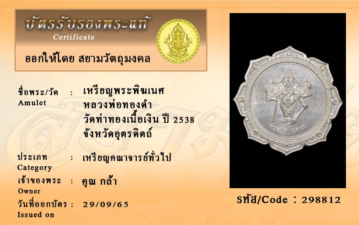 รหัสสินค้า : 298812 เหรียญพระพิฆเนศ หลวงพ่อทองดำ วัดท่าทองเนื้อเงิน ปี 2538 จังหวัดอุตรดิตถ์