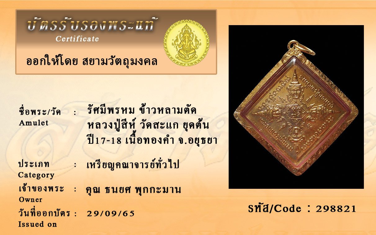 รหัสสินค้า : 298821 รัศมีพรหม ข้าวหลามตัด หลวงปู่สีห์ วัดสะแก ยุดต้น ปี17-18 เนื้อทองคำ จ.อยุธยา