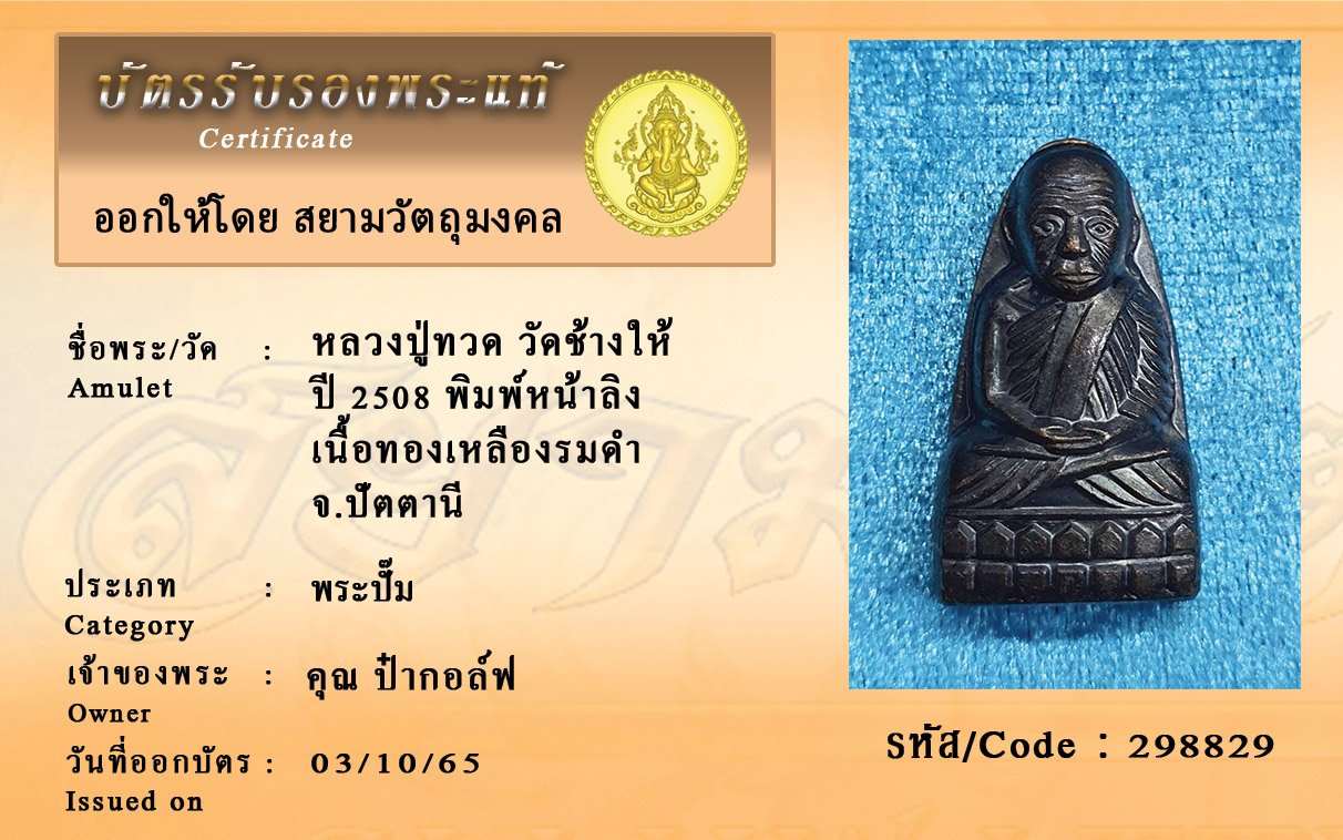 รหัสสินค้า : 298829 หลวงปู่ทวด วัดช้างให้ ปี 2508 พิมพ์หน้าลิง เนื้อทองเหลืองรมดำ จ.ปัตตานี