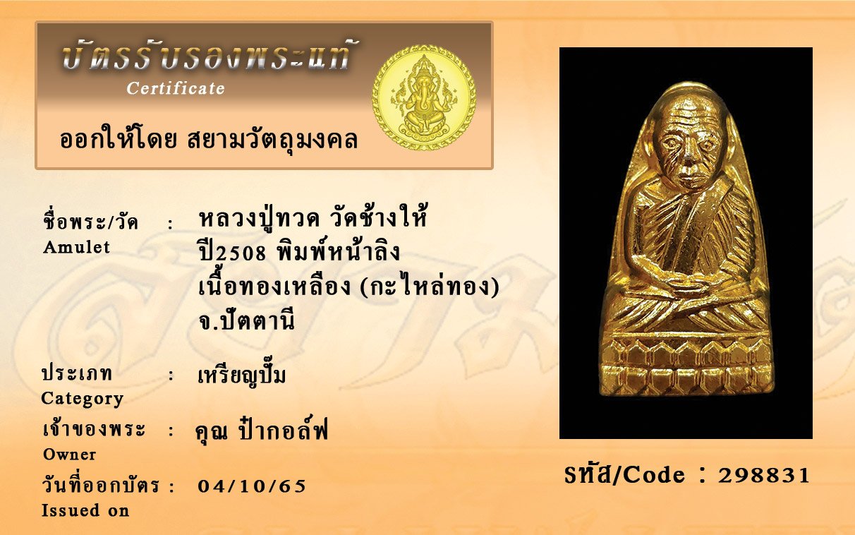 รหัสสินค้า : 298831 หลวงปู่ทวด วัดช้างให้ ปี2508 พิมพ์หน้าลิง เนื้อทองเหลือง (กะไหล่ทอง) จ.ปัตตานี