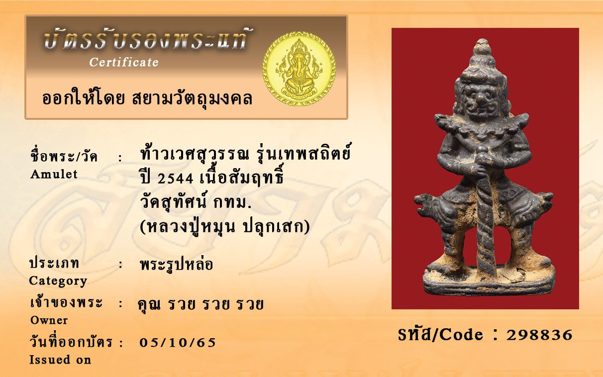 รหัสสินค้า : 298836 ท้าวเวศสุวรรณ รุ่นเทพสถิตย์ ปี 2544 เนื้อสัมฤทธิ์ วัดสุทัศน์ กทม. (หลวงปู่หมุน ปลุกเสก)