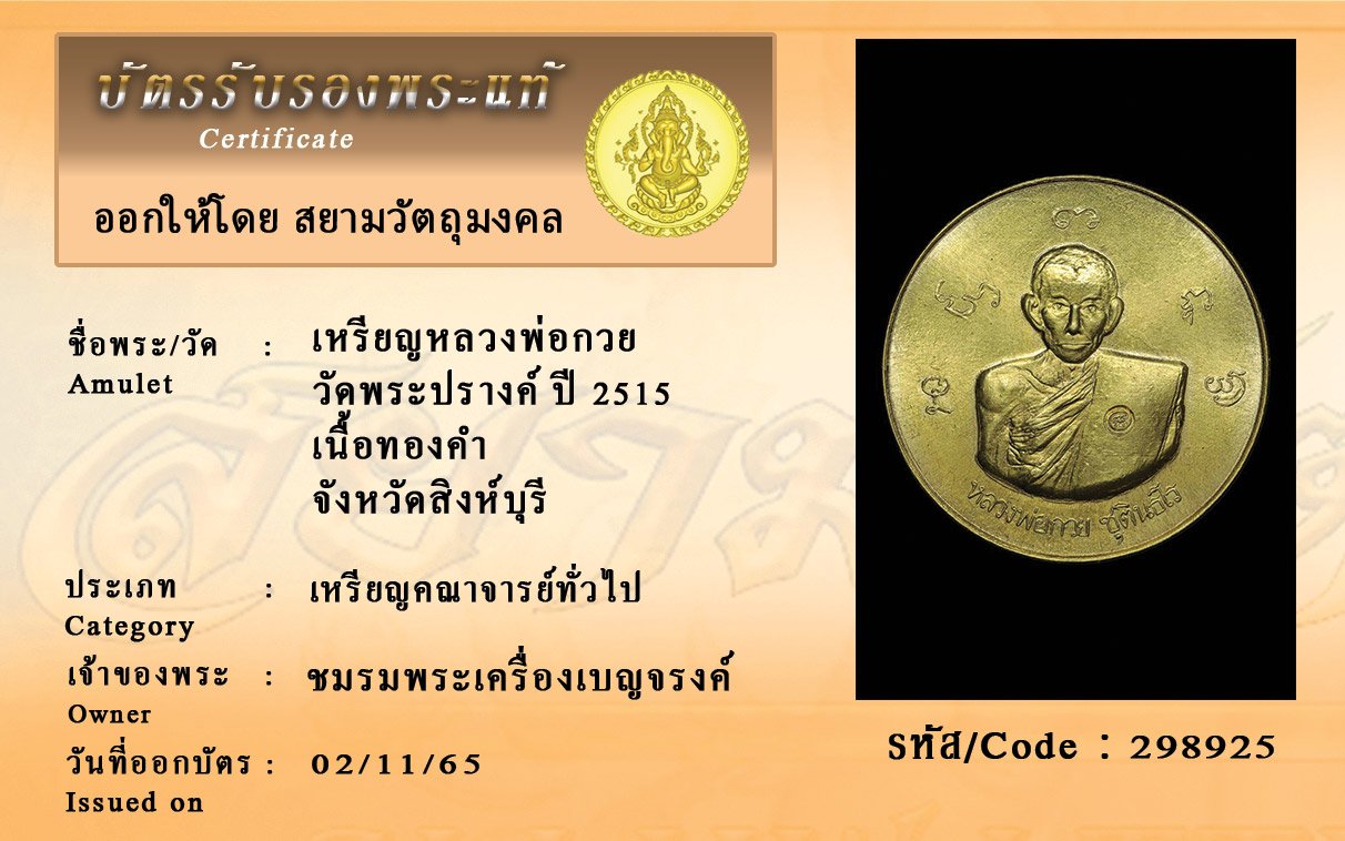 รหัสสินค้า : 298925 เหรียญหลวงพ่อกวย วัดพระปรางค์ ปี 2515 เนื้อทองคำ จังหวัดสิงห์บุรี