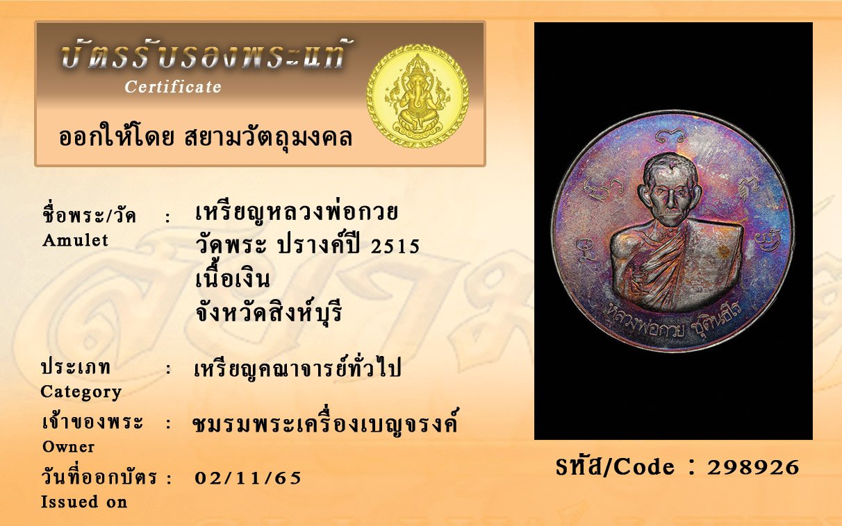 รหัสสินค้า : 298926 เหรียญหลวงพ่อกวย วัดพระ ปรางค์ปี 2515 เนื้อเงิน จังหวัดสิงห์บุรี