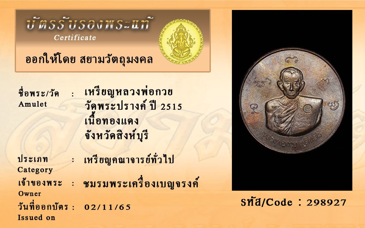 รหัสสินค้า : 298927 เหรียญหลวงพ่อกวย วัดพระปรางค์ ปี 2515 เนื้อทองแดง จังหวัดสิงห์บุรี