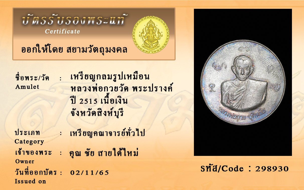 รหัสสินค้า : 298930 เหรียญกลมรูปเหมือน หลวงพ่อกวยวัด พระปรางค์ ปี 2515 เนื้อเงิน จังหวัดสิงห์บุรี