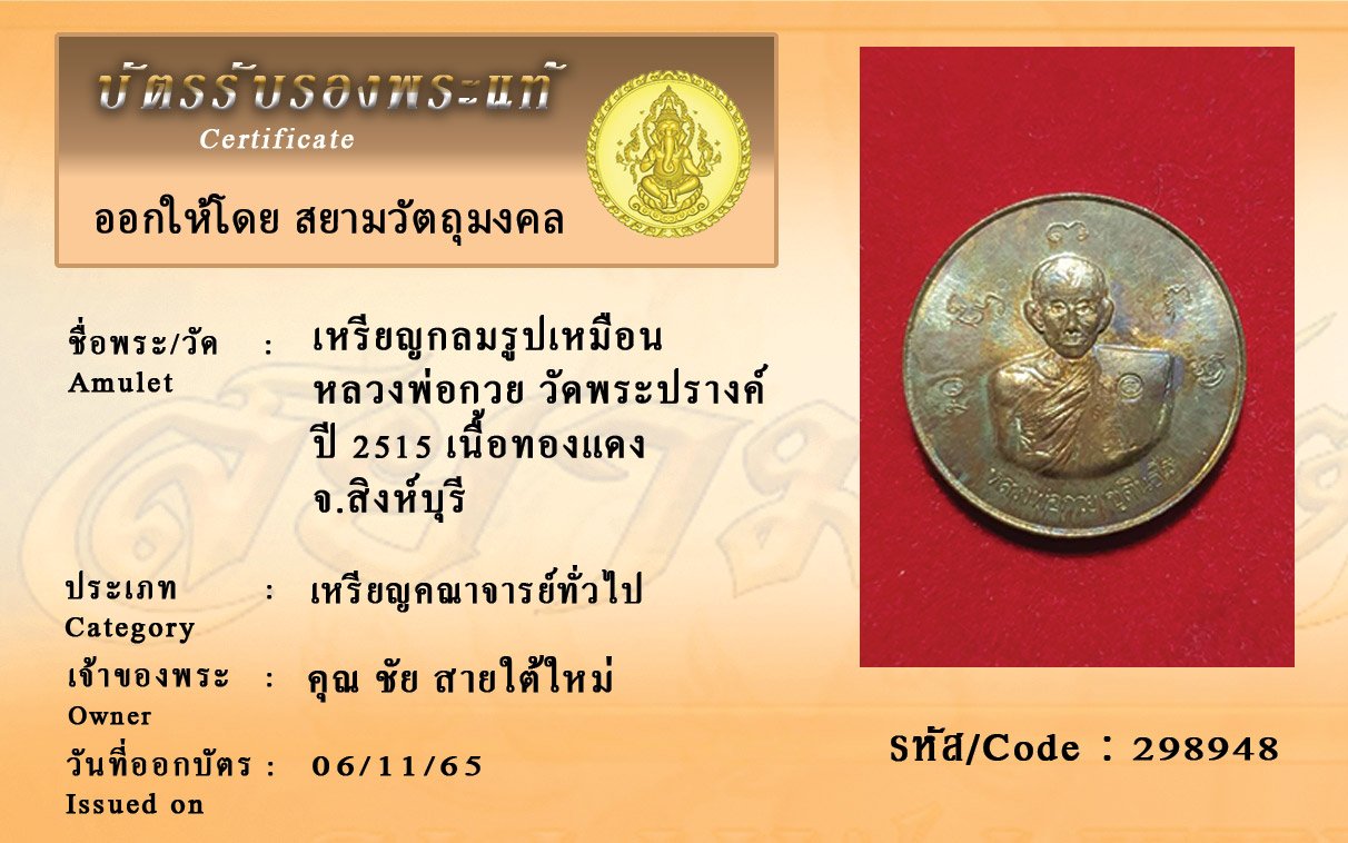 รหัสสินค้า : 298948 เหรียญกลมรูปเหมือน หลวงพ่อกวย วัดพระปรางค์ ปี 2515 เนื้อทองแดง จ.สิงห์บุรี