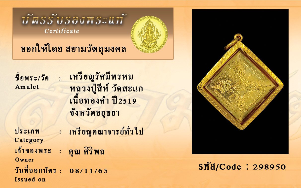 รหัสสินค้า : 298950 เหรียญรัศมีพรหม หลวงปู่สีห์ วัดสะแก เนื้อทองคำ ปี2519 จังหวัดอยุธยา