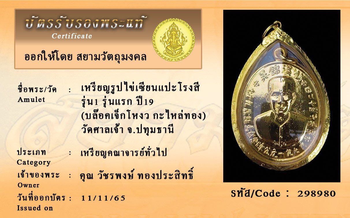 รหัสสินค้า : 298980 เหรียญรูปไข่เซียนแปะโรงสี รุ่น1 รุ่นแรก ปี19 (บล๊อคเจ็กโหงว กะไหล่ทอง) วัดศาลเจ้า จ.ปทุมธานี