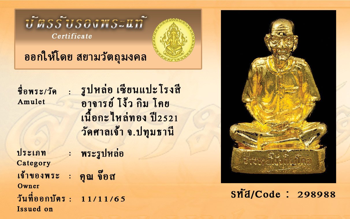 รหัสสินค้า : 298988 รูปหล่อ เซียนแปะโรงสี อาจารย์ โง้ว กิม โคย เนื้อกะไหล่ทอง ปี2521 วัดศาลเจ้า จ.ปทุมธานี
