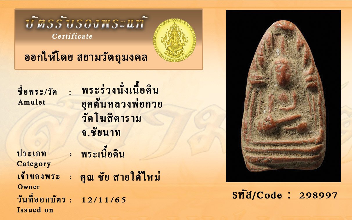 รหัสสินค้า : 298997 พระร่วงนั่งเนื้อดิน ยุคต้นหลวงพ่อกวย วัดโฆสิตาราม จ.ชัยนาท