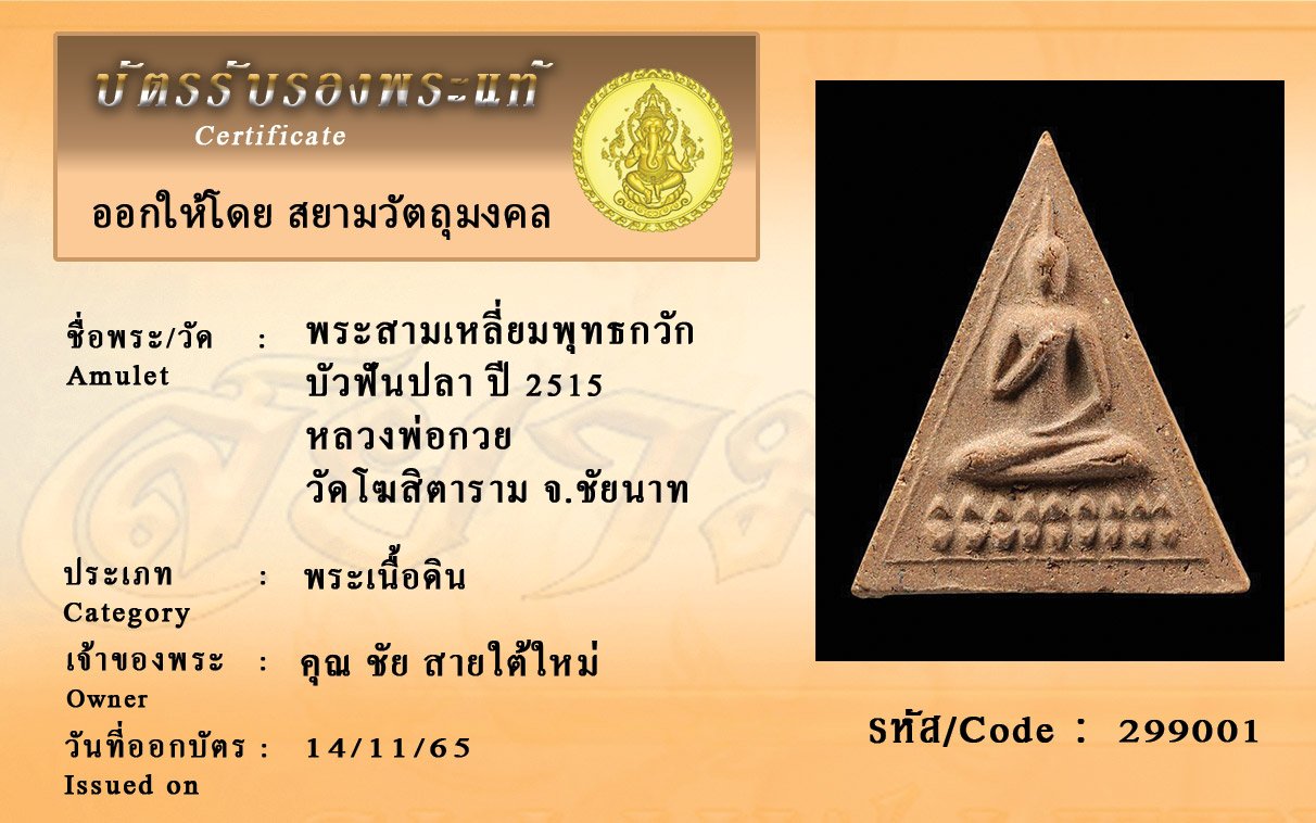 รหัสสินค้า : 299001 พระสามเหลี่ยมพุทธกวัก บัวฟันปลา ปี 2515 หลวงพ่อกวย วัดโฆสิตาราม จ.ชัยนาท