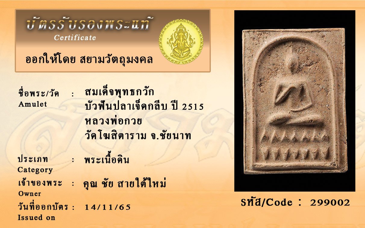 รหัสสินค้า : 299002 สมเด็จพุทธกวัก บัวฟันปลาเจ็ดกลีบ ปี 2515 หลวงพ่อกวย วัดโฆสิตาราม จ.ชัยนาท