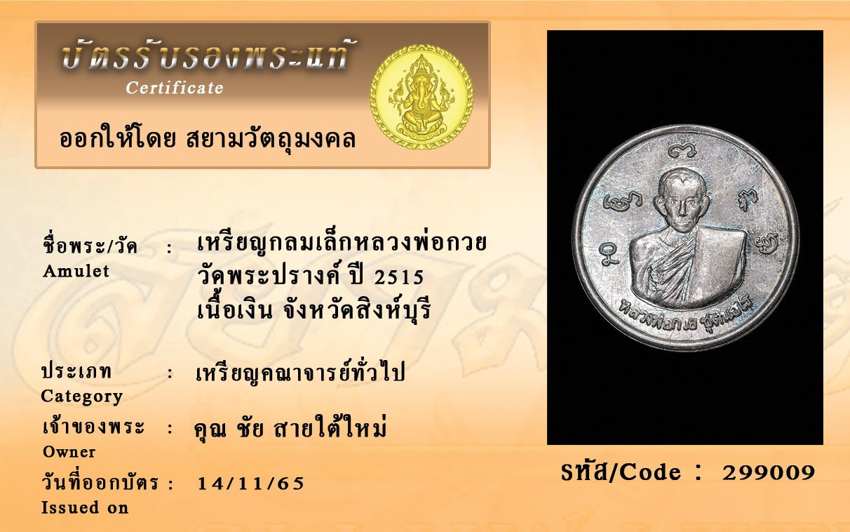 รหัสสินค้า : 299009 เหรียญกลมเล็กหลวงพ่อกวย วัดพระปรางค์ ปี 2515 เนื้อเงิน จังหวัดสิงห์บุรี