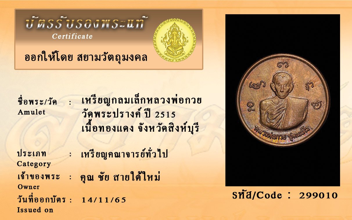 รหัสสินค้า : 299010 เหรียญกลมเล็กหลวงพ่อกวย วัดพระปรางค์ ปี 2515 เนื้อทองแดง จังหวัดสิงห์บุรี