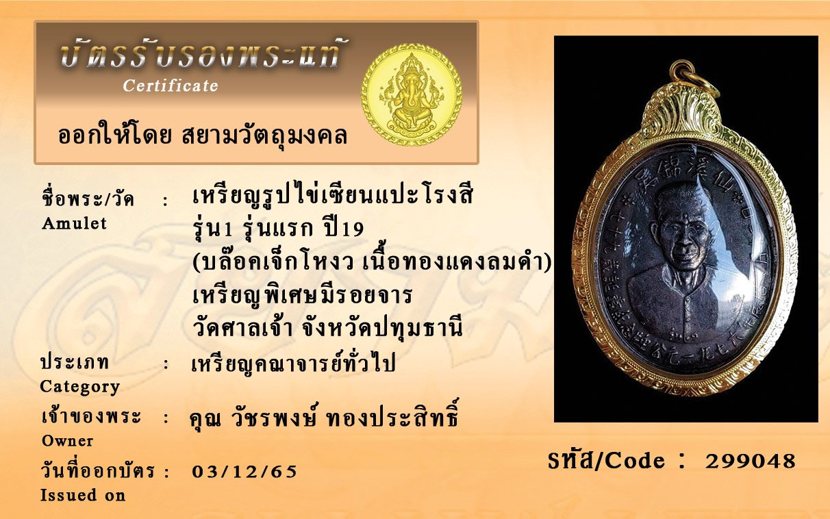 รหัสสินค้า : 299048 เหรียญรูปไข่เซียนแปะโรงสี รุ่น1 รุ่นแรก ปี19 (บล๊อคเจ็กโหงว เนื้อทองแดงลมดำ) เหรียญพิเศษมีรอยจาร วัดศาลเจ้า จังหวัดปทุมธานี