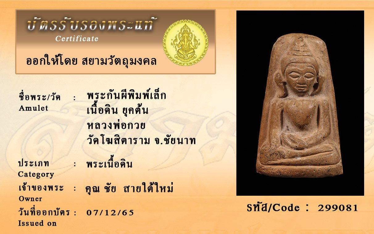 รหัสสินค้า : 299081 พระกันผีพิมพ์เล็ก เนื้อดิน ยุคต้น หลวงพ่อกวย วัดโฆสิตาราม จ.ชัยนาท