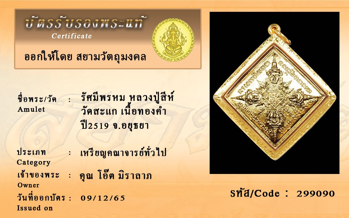 รหัสสินค้า : 299090 รัศมีพรหม หลวงปู่สีห์ วัดสะแก เนื้อทองคำ ปี2519 จ.อยุธยา