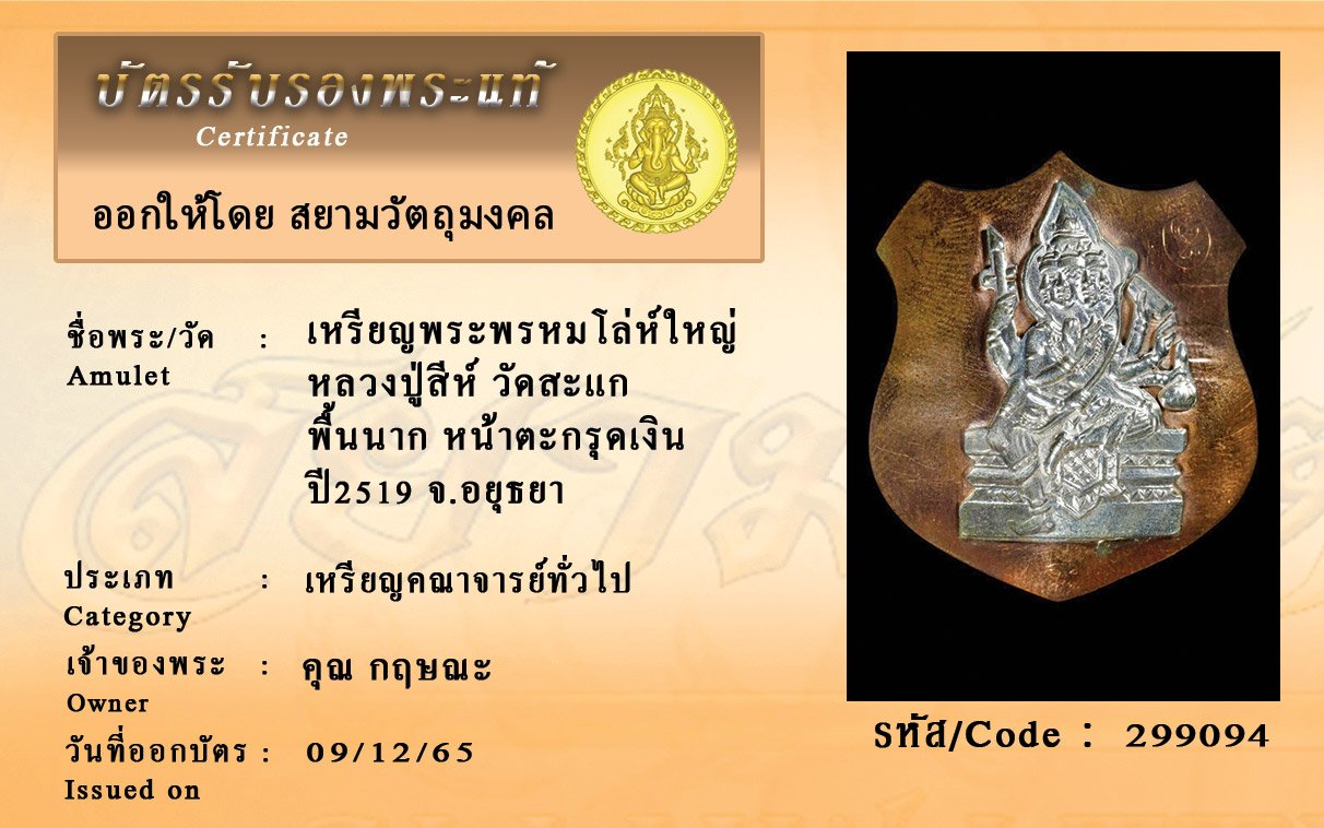 รหัสสินค้า : 299094 เหรียญพระพรหมโล่ห์ใหญ่ หลวงปู่สีห์ วัดสะแก พื้นนาก หน้าตะกรุดเงิน ปี2519 จ.อยุธยา