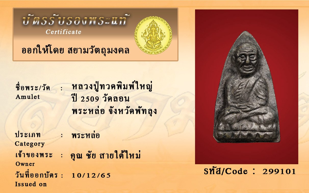รหัสสินค้า : 299101 หลวงปู่ทวดพิมพ์ใหญ่ ปี 2509 วัดลอน พระหล่อ จังหวัดพัทลุง