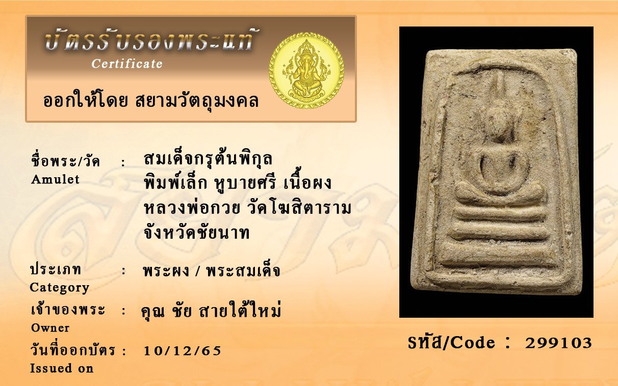 รหัสสินค้า : 299103 สมเด็จกรุต้นพิกุล พิมพ์เล็ก หูบายศรี เนื้อผง หลวงพ่อกวย วัดโฆสิตาราม จังหวัดชัยนาท