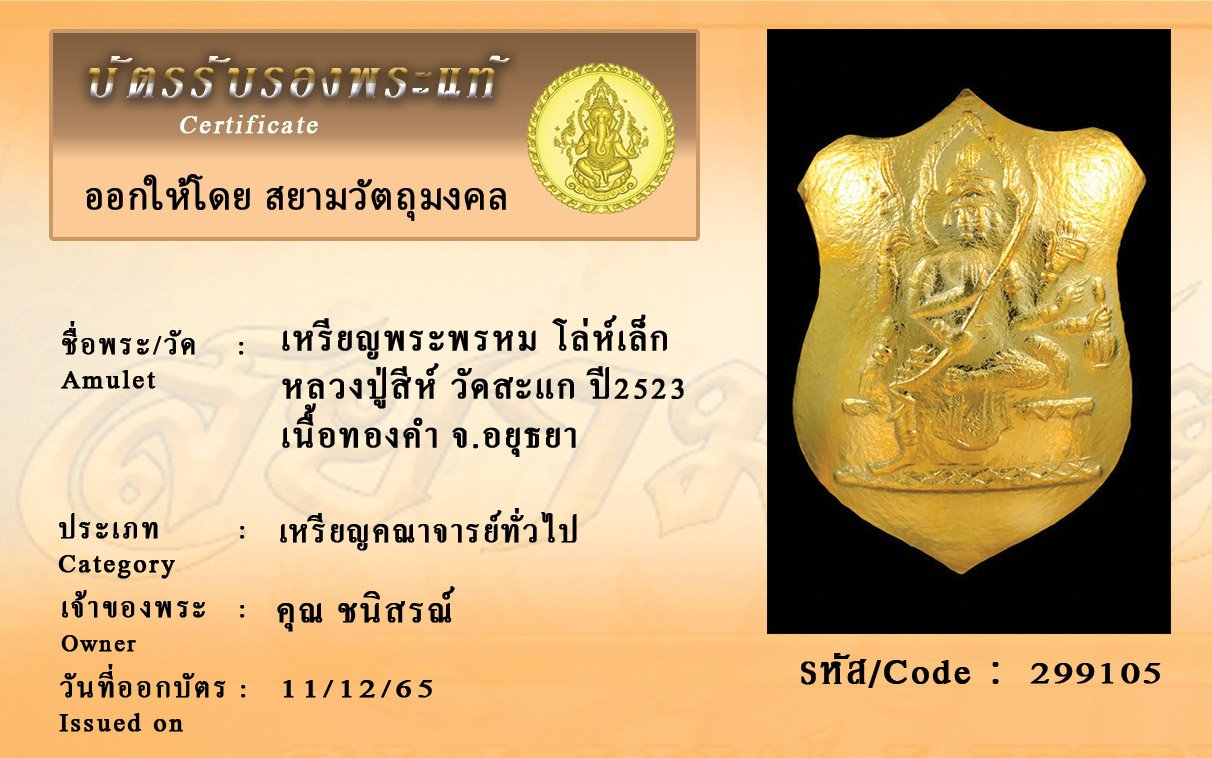 รหัสสินค้า : 299105 เหรียญพระพรหม โล่ห์เล็ก หลวงปู่สีห์ วัดสะแก ปี2523 เนื้อทองคำ จ.อยุธยา
