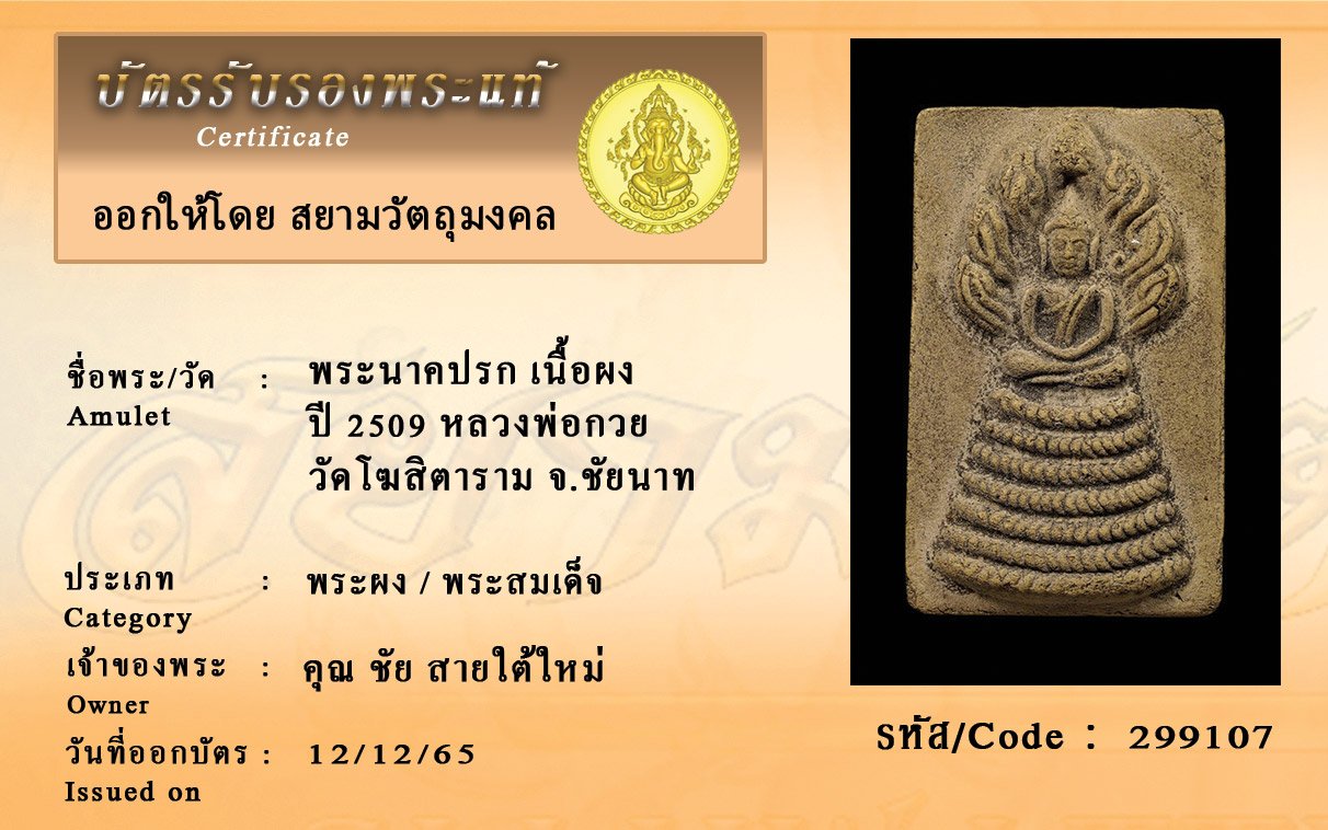 รหัสสินค้า : 299107 พระนาคปรก เนื้อผง ปี 2509 หลวงพ่อกวย วัดโฆสิตาราม จ.ชัยนาท
