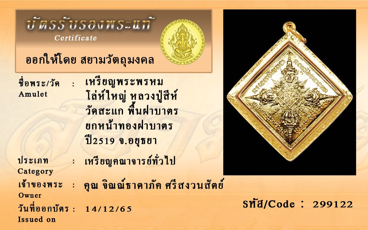 รหัสสินค้า : 299120 เหรียญรัศมีพรหม ข้าวหลามตัด หลวงปู่สีห์ วัดสะแก เนื้อทองคำ ปี2519 จ.อยุธยา