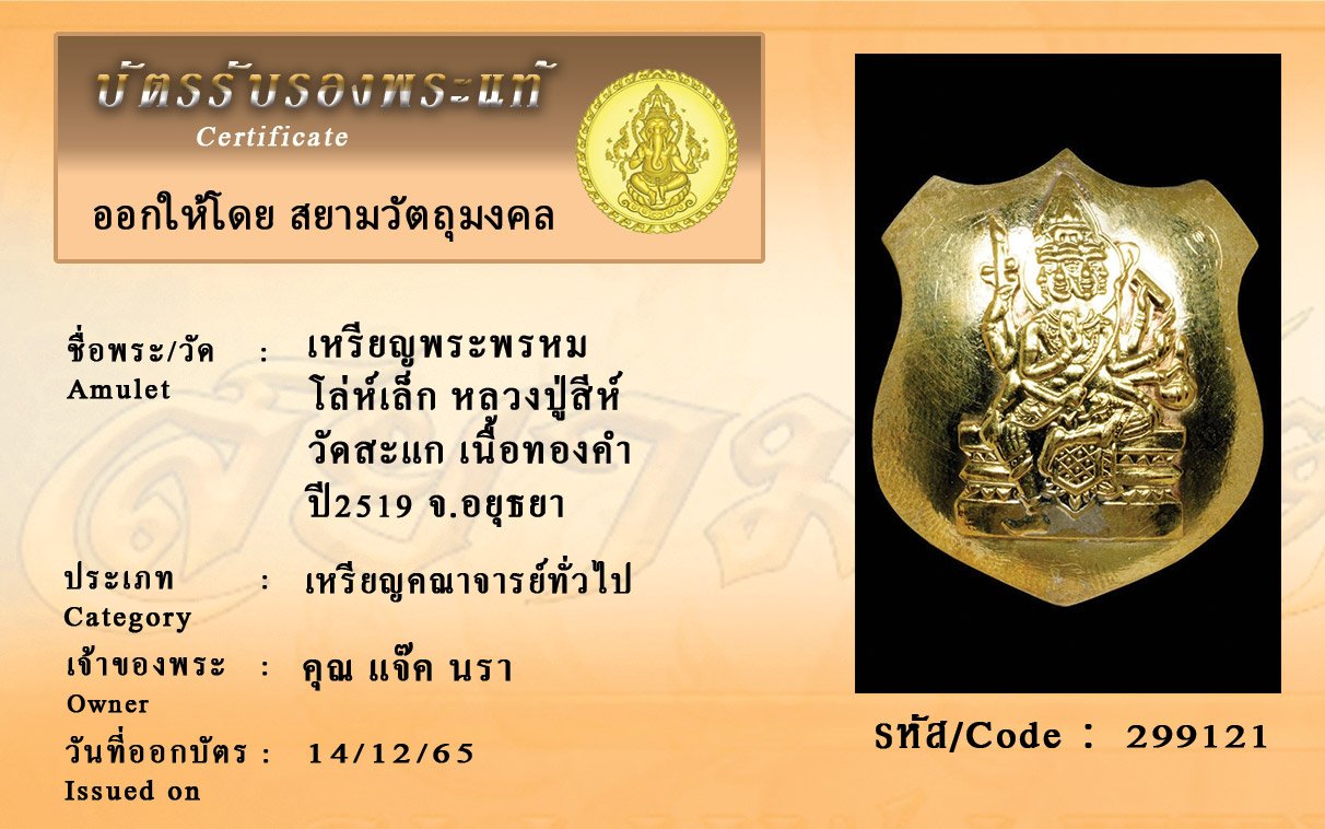 รหัสสินค้า : 299122 เหรียญพระพรหม โล่ห์ใหญ่ หลวงปู่สีห์ วัดสะแก พื้นฝาบาตร ยกหน้าทองฝาบาตร ปี2519 จ.อยุธยา