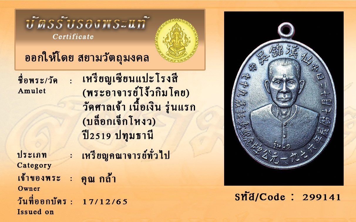 รหัสสินค้า : 299141 เหรียญเซียนแปะโรงสี (พระอาจารย์โง้วกิมโคย) วัดศาลเจ้า เนื้อเงิน รุ่นแรก (บล็อกเจ็กโหงว) ปี2519 ปทุมธานี