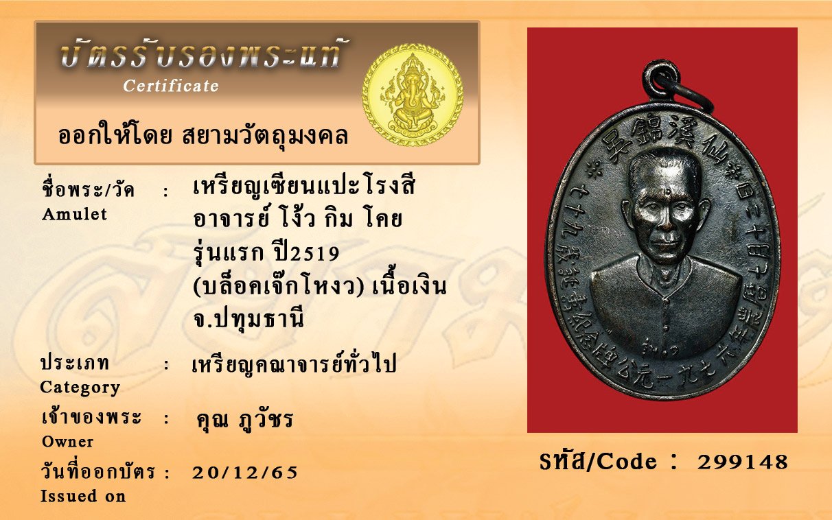 รหัสสินค้า : 299148 เหรียญเซียนแปะโรงสี อาจารย์ โง้ว กิม โคย รุ่นแรก ปี2519 (บล็อคเจ๊กโหงว) เนื้อเงิน จ.ปทุมธานี