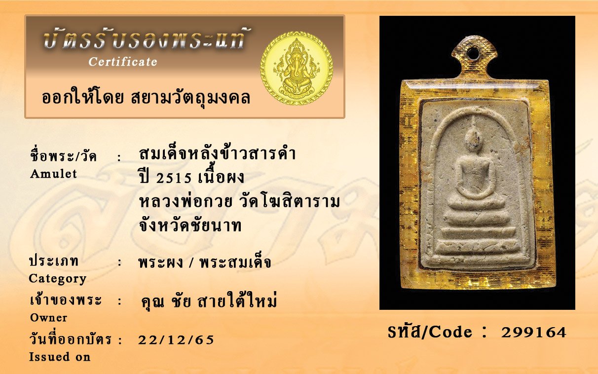 รหัสสินค้า : 299164 สมเด็จหลังข้าวสารดำ ปี 2515 เนื้อผง หลวงพ่อกวย วัดโฆสิตาราม จังหวัดชัยนาท