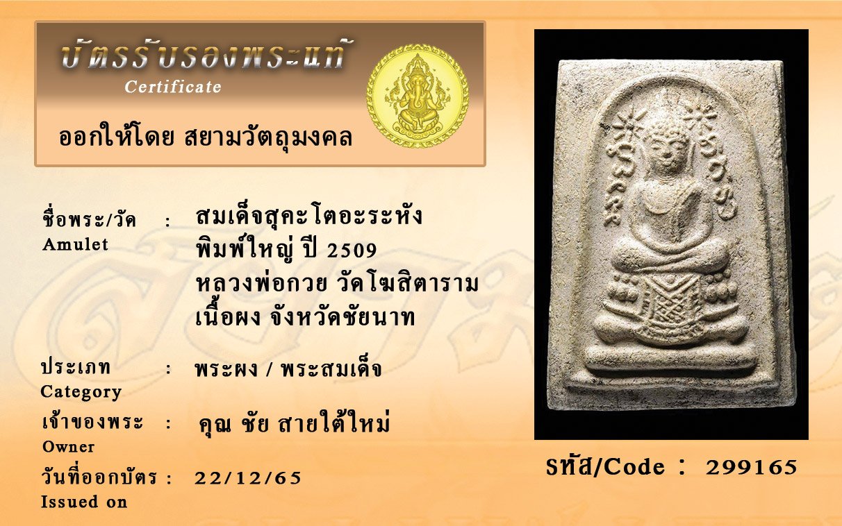 รหัสสินค้า : 299165 สมเด็จสุคะโตอะระหัง พิมพ์ใหญ่ ปี 2509 หลวงพ่อกวย วัดโฆสิตาราม เนื้อผง จังหวัดชัยนาท