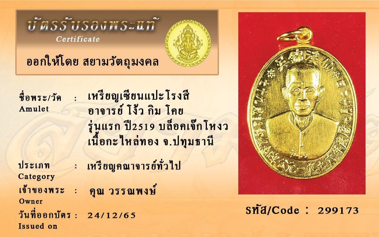 รหัสสินค้า : 299173 เหรียญเซียนแปะโรงสี อาจารย์ โง้ว กิม โคย รุ่นแรก ปี2519 บล็อคเจ๊กโหงว เนื้อกะไหล่ทอง จ.ปทุมธานี