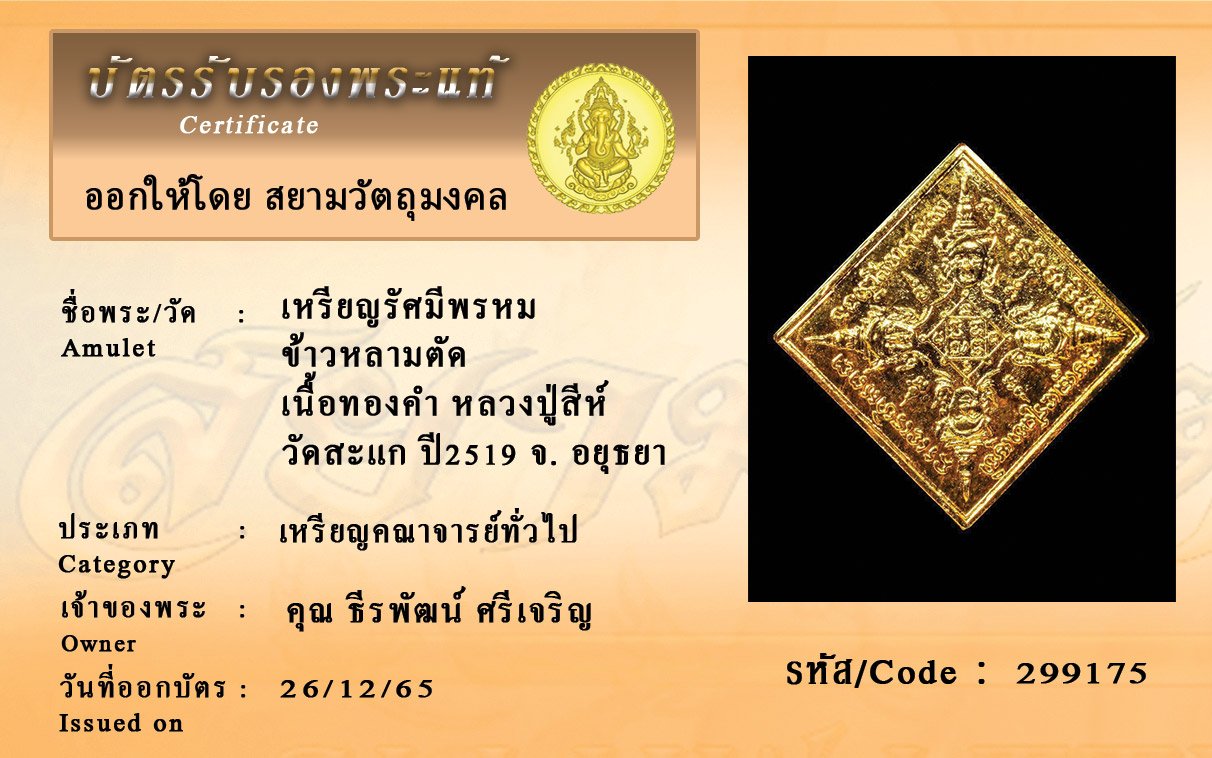 รหัสสินค้า : 299175 เหรียญรัศมีพรหม ข้าวหลามตัด เนื้อทองคำ หลวงปู่สีห์ วัดสะแก ปี2519 จ. อยุธยา