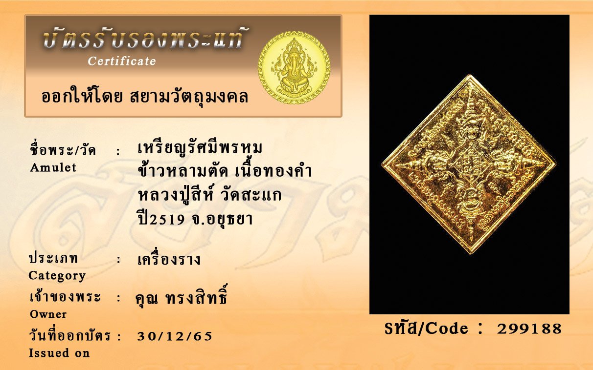 รหัสสินค้า : 299188 เหรียญรัศมีพรหม ข้าวหลามตัด เนื้อทองคำ หลวงปู่สีห์ วัดสะแก ปี2519 จ.อยุธยา
