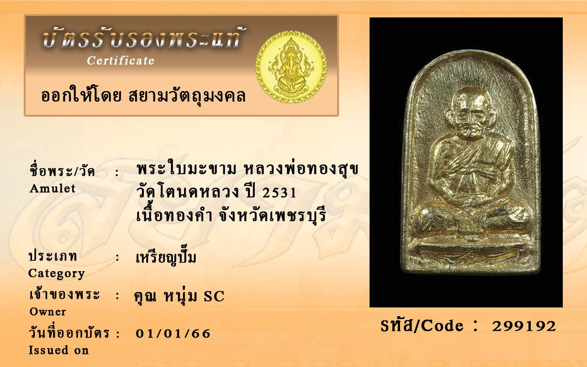 รหัสสินค้า : 299192 พระใบมะขาม หลวงพ่อทองสุข วัดโตนดหลวง ปี 2531 เนื้อทองคำ จังหวัดเพชรบุรี